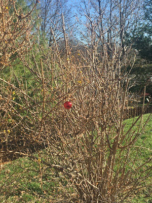 For the past eight years I've attended a meeting at a nearby church on Friday morning. I enjoy going there; the staff is welcoming and the facilities are always clean. Today on my way out of the parking lot I decided to offer them a little Christmas Thank You by hanging an ornament in a forsythia bush.